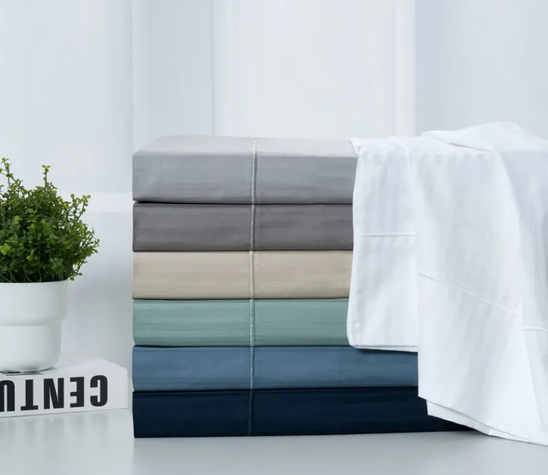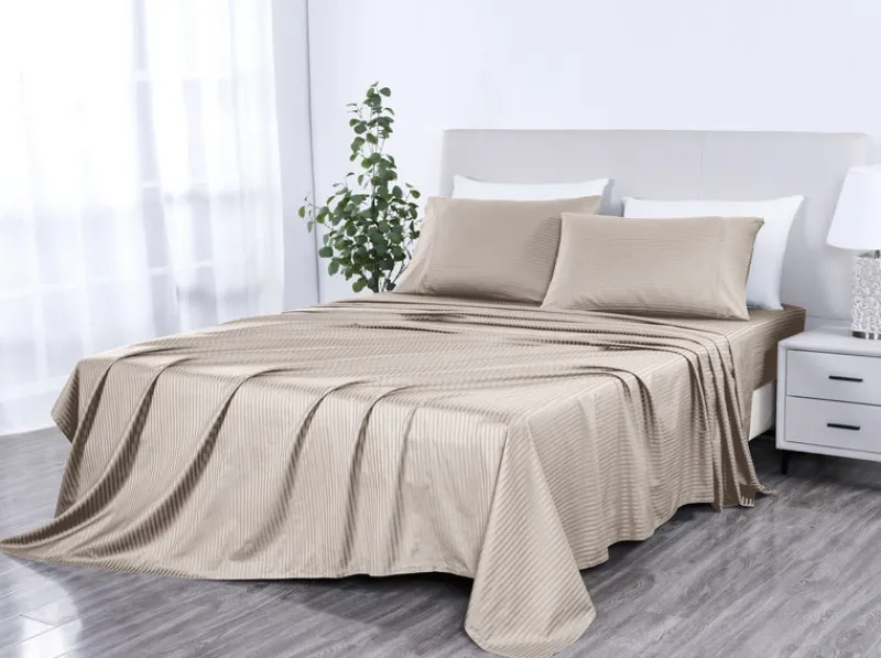 Class and sophistication define this Kathy Ireland 500 Thread Count stripe sheet set. Using only the finest in long staple cotton, the woven delicate stripes into each set that not only add textural depth but also create a beautiful designer accent look. The sateen style weave allows for a radiant sheen while the subtle breakthroughs stitching on the flat sheet and pillowcases add just the right amount of stylish detail to each piece. The fitted sheets include our exceptional one-inch-thick elastic edging to ensure tight fitting of most mattress sizes and also offer a generous 16-inch pocket depth.