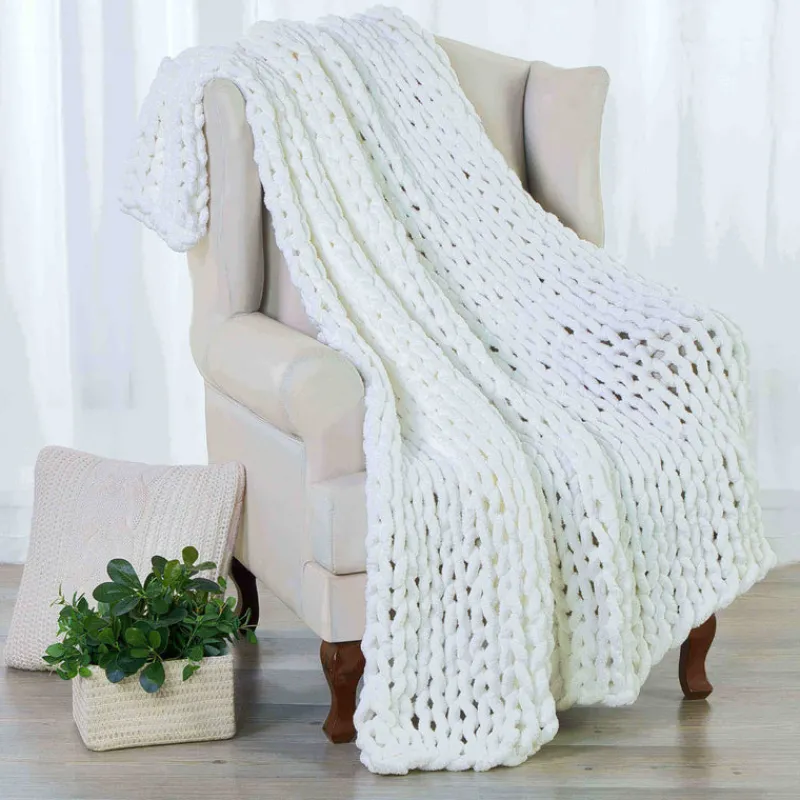 A giant knitted cozy pattern and a luxurious feel, this soft chenille chunky knit throw by Kathy Ireland fits into many décor themes from farmhouse to traditional, hygge, cottage, coastal and more. Premium chenille acrylic creates incredibly soft and luxurious feeling. The exaggerated cable design plus bulky chenille texture will be a personality statement piece to you and your space!