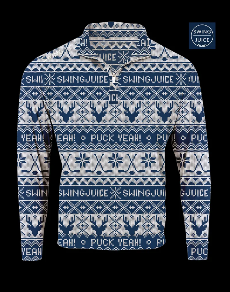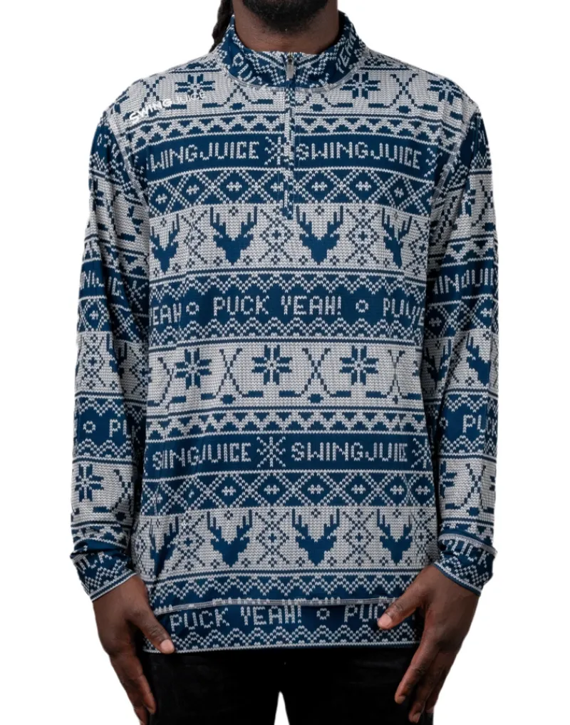Celebrate the holidays with the Hockey Puck Yeah Fairisle Men’s Quarter Zip. Featuring a festive print with hockey sticks and the phrase “Puck Yeah!” this pullover brings holiday cheer to your wardrobe. Crafted from breathable EcoTec micro polyester, it offers comfort and style.