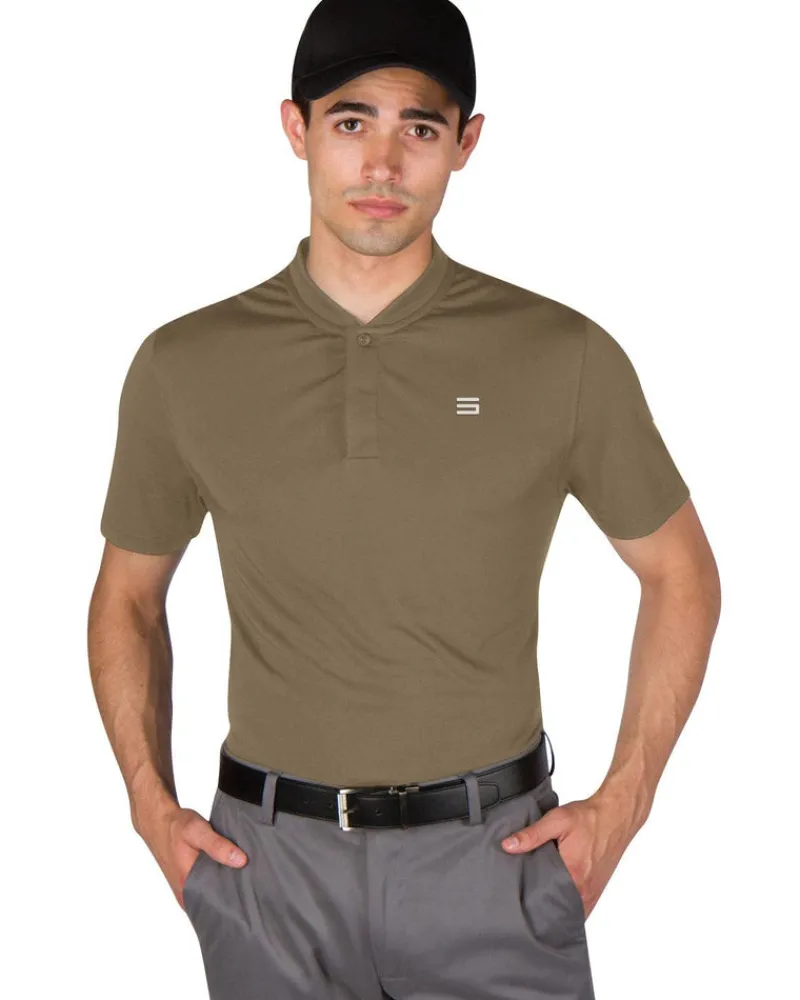 These short-sleeved polos are made with a modern collarless blade design and feature a two button placket hidden behind the shirt’s flap for a clean and modern look. A rounded hem at the bottom of the shirt allows you to wear this shirt tucked or untucked without compromising style.