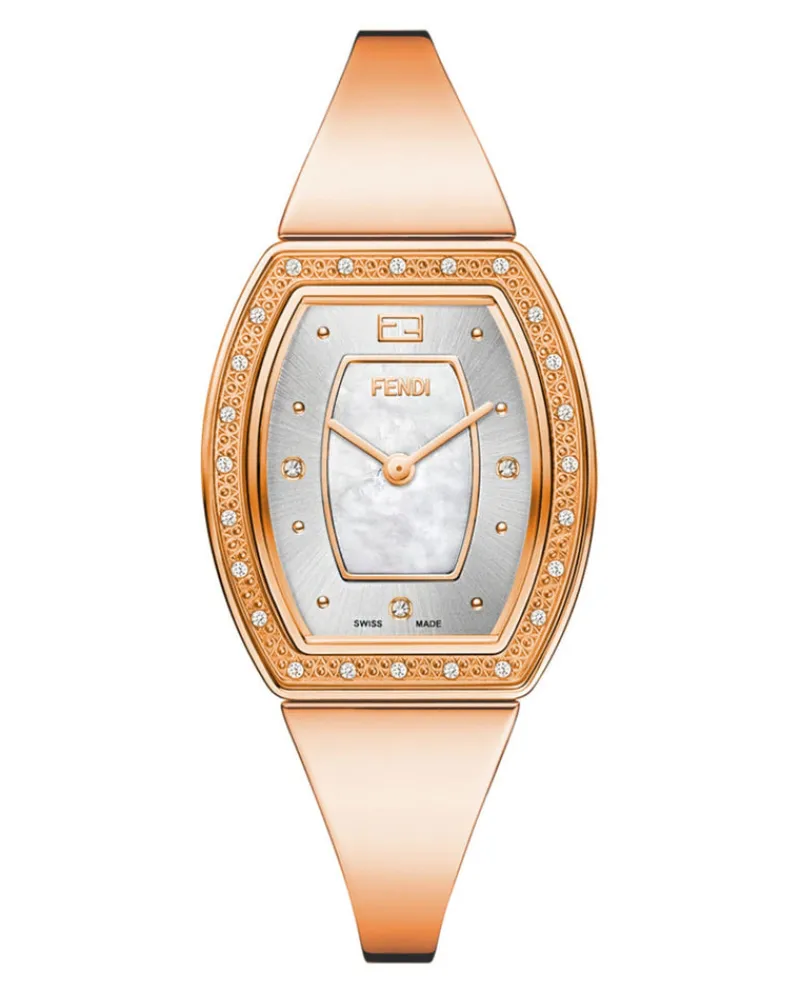 - 28 x 32.5 mm, rose gold colored stainless steel tonneau-shaped case, Bezel set with 24 diamonds, approx. 0.13 carats, sapphire crystal. Grey sunray dial with white mother-of-pearl center dial, Fendi logo at 12 o’clock, applied rose gold colored studs as i