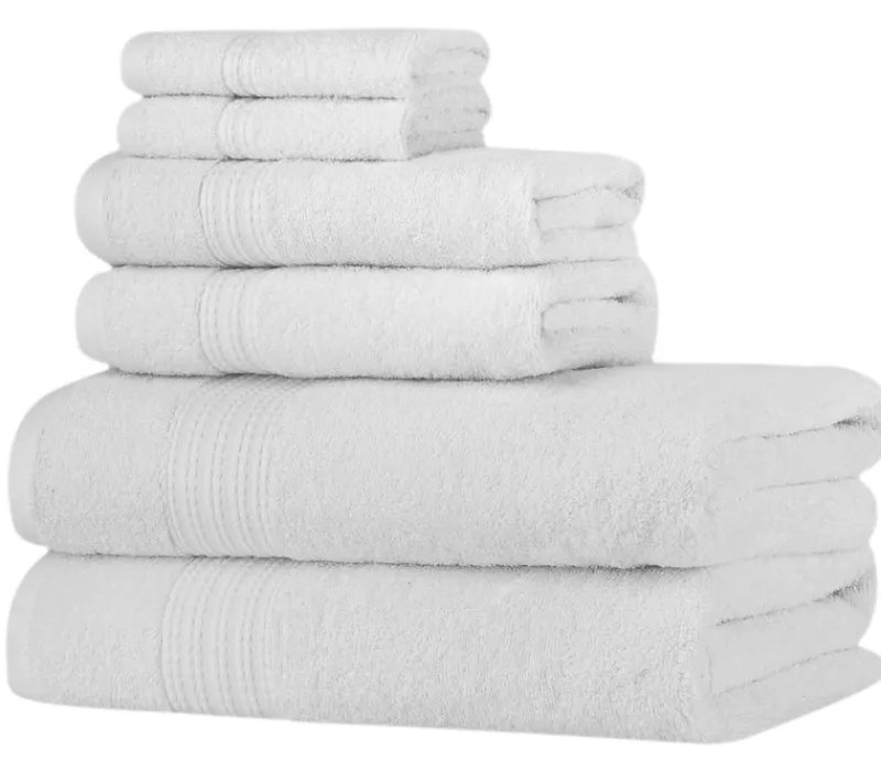 This set Includes 2 large bath towels (30 x 54 inches), 2 hand towels (16 x 27 inches), and 2 washcloths (12 x 12 inches).