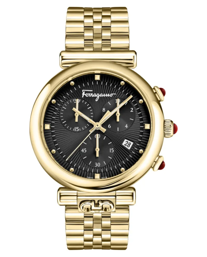 Fulfilled by our friends at Carro Luxury MaisonDETAILSSwiss Made Chronograph Date Quartz Movement40.00mm IP Yellow Gold …