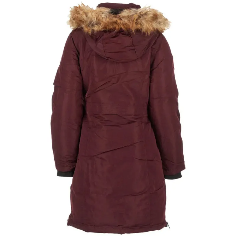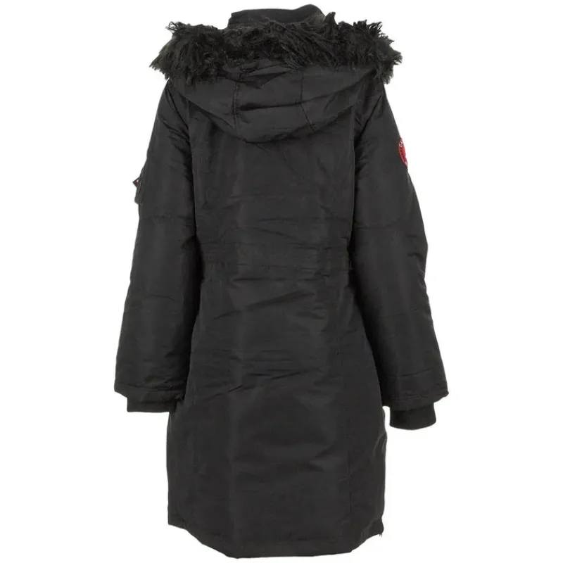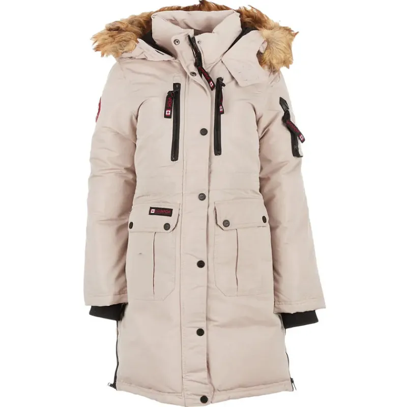 - Shell: 100% Polyester. Hood Lining: 100% Polyester. Body/Sleeve Lining: 100% Polyester. Filling: 100% Polyester. Hood Faux Fur Trim: 75% Acrylic, 25% Polyester. Rib Knit: 100% Polyester.