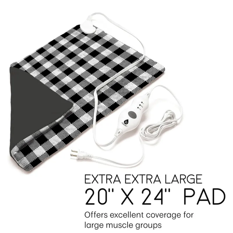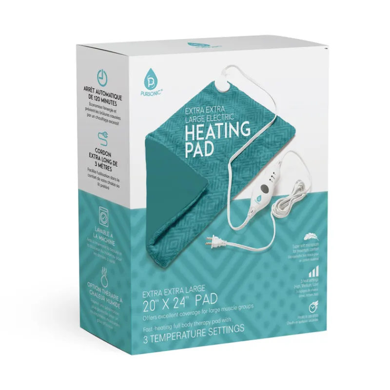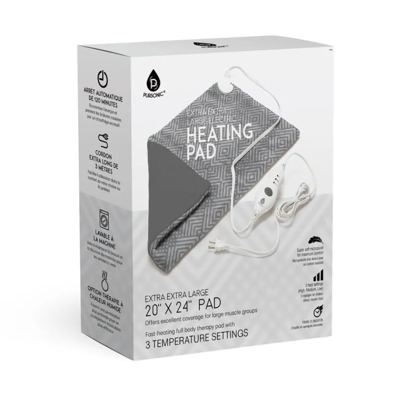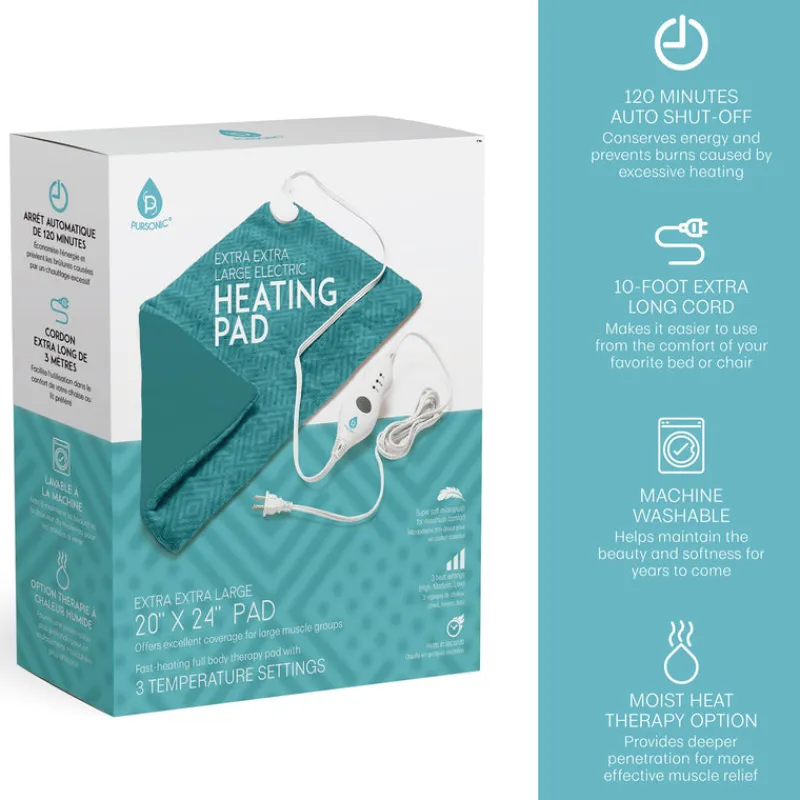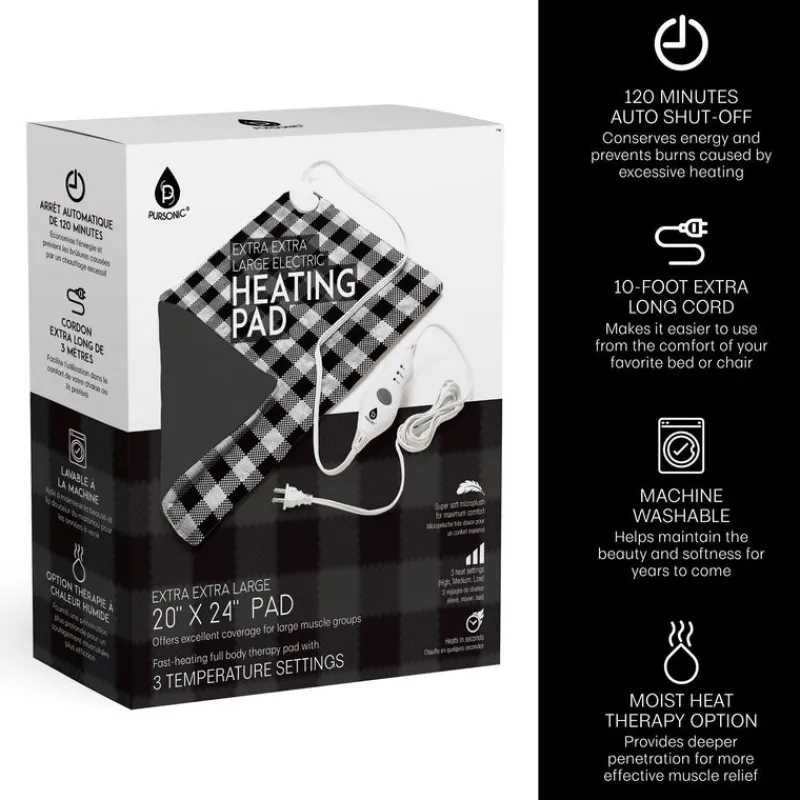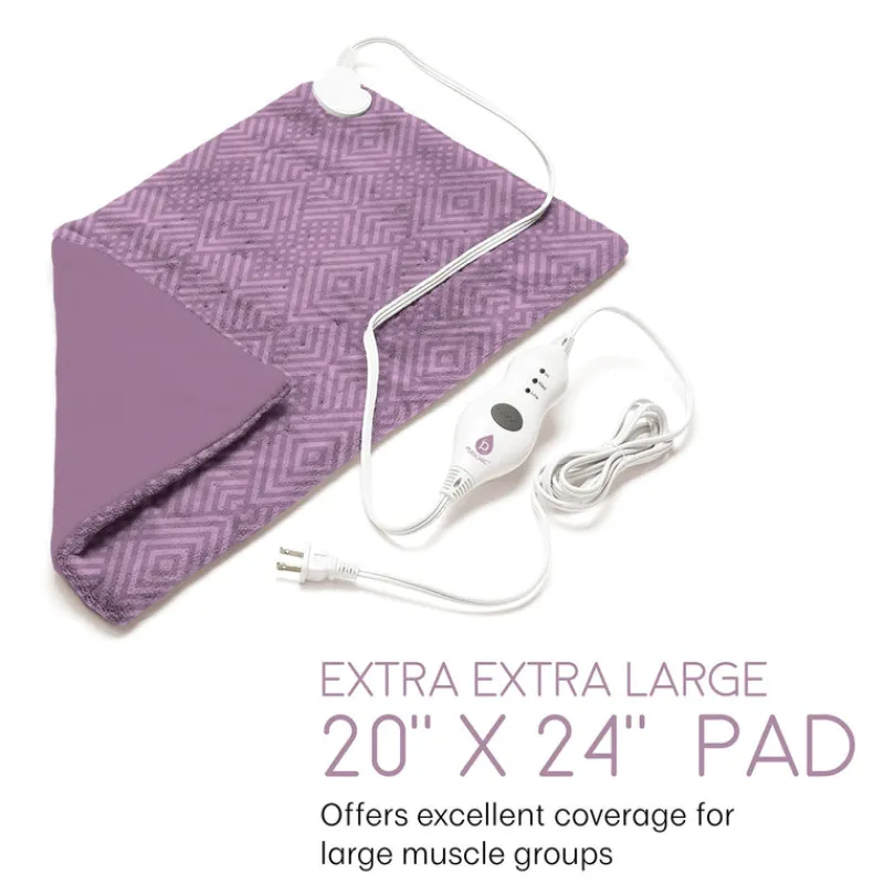 Features extra Extra large size, 3 heat settings/moisture/dry options & soft micro plush fibers for comfort. Machine washable. Provides effective relief from sore muscles, cramps & back pain.