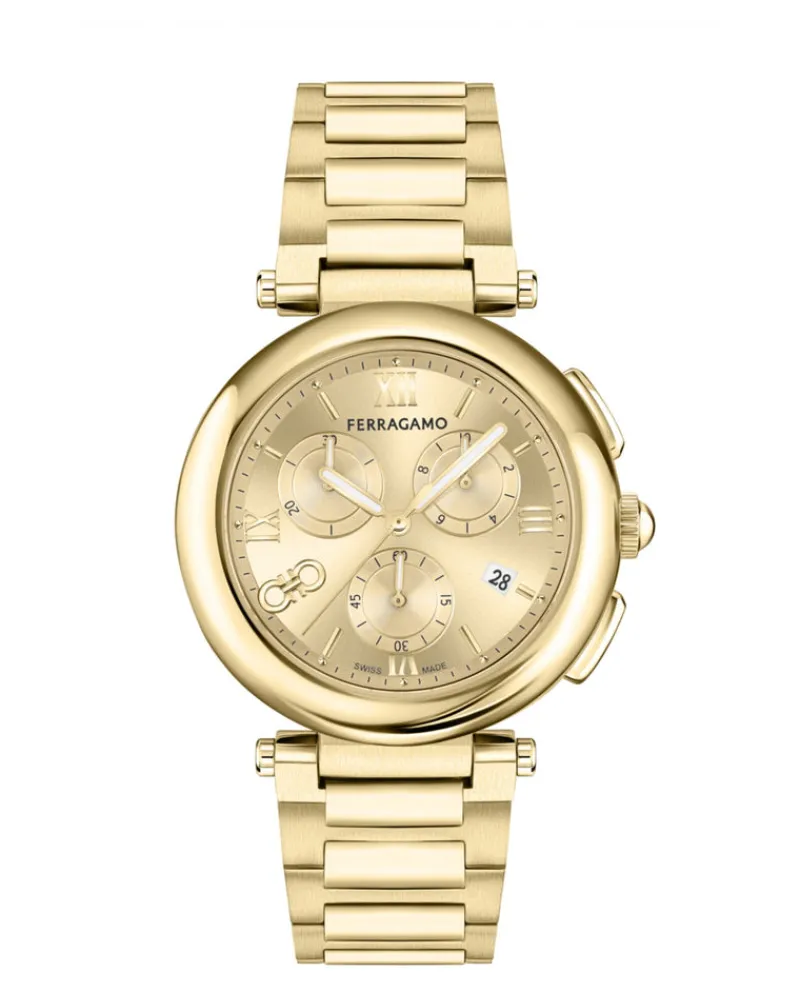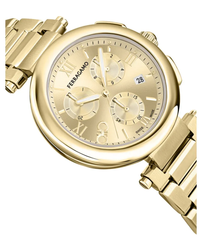 Fulfilled by our friends at Carro Luxury MaisonDETAILSSwiss Made Chronograph Date Quartz Movement40mm IP Yellow GoldIP Y…