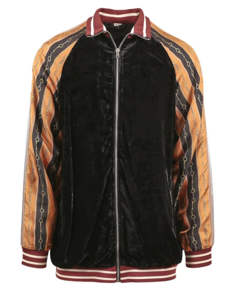 - Horsebit printed raglan sleeves; Contrast ribbed cuffs and hem; Silver-tone hardware; Two front welt pockets and one interior jetted pocket