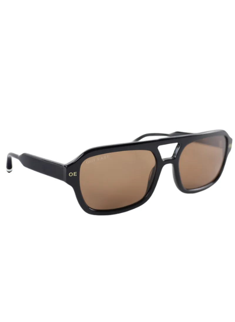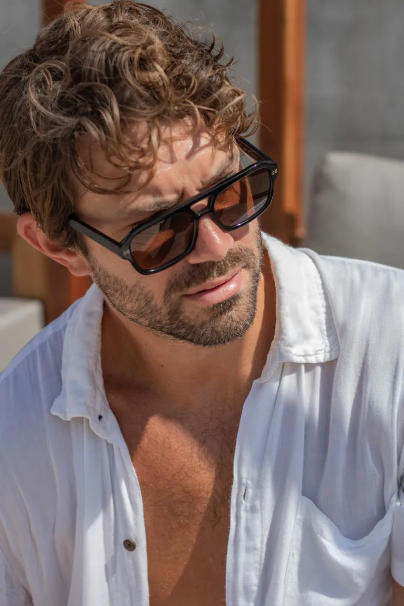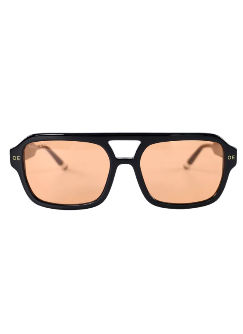 The Sayres is a unisex retro-inspired aviator featuring both a toffee or orange lens. Handcrafted from black Italian acetate, this style not only flatters the face, but the lens color combinations make it the ultimate trending summer style.