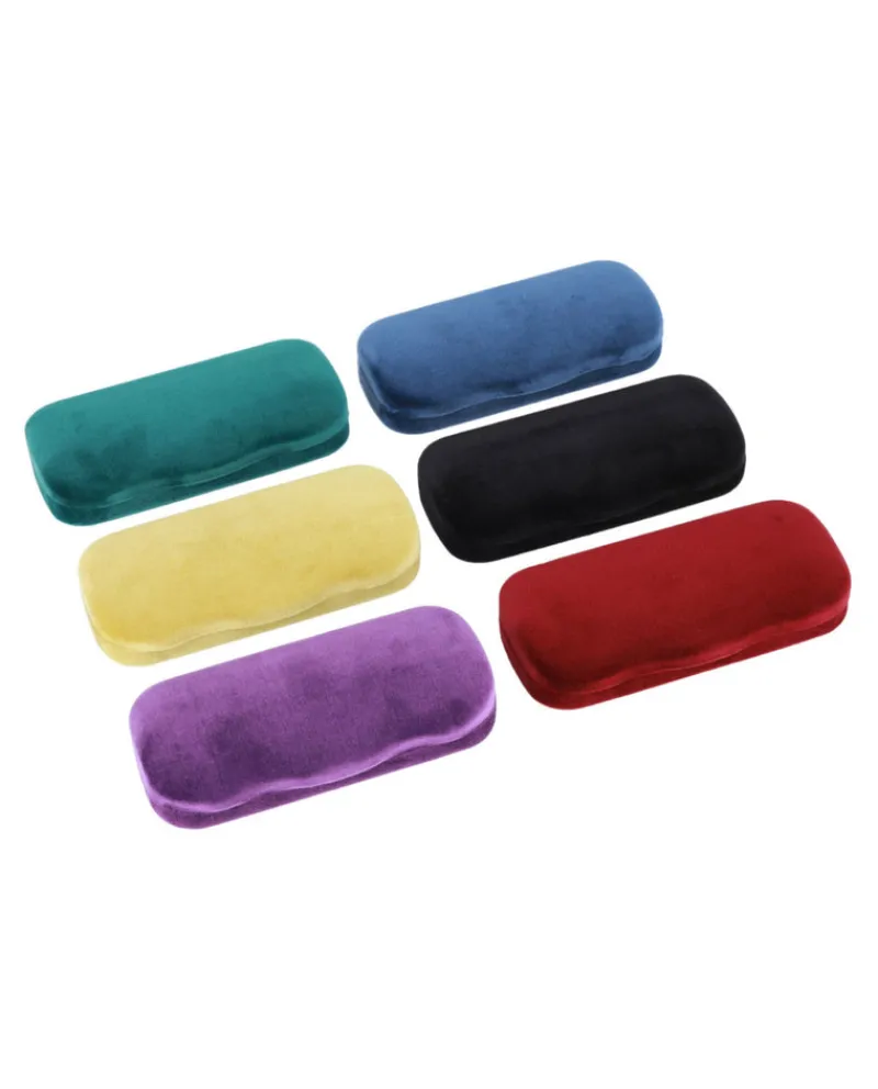 - Glasses come with a velvet case in one of six jewel-toned shades. The case color is hand selected for each pair of glasses. Also included is a matching satin flannel pouch and microfiber cloth.
