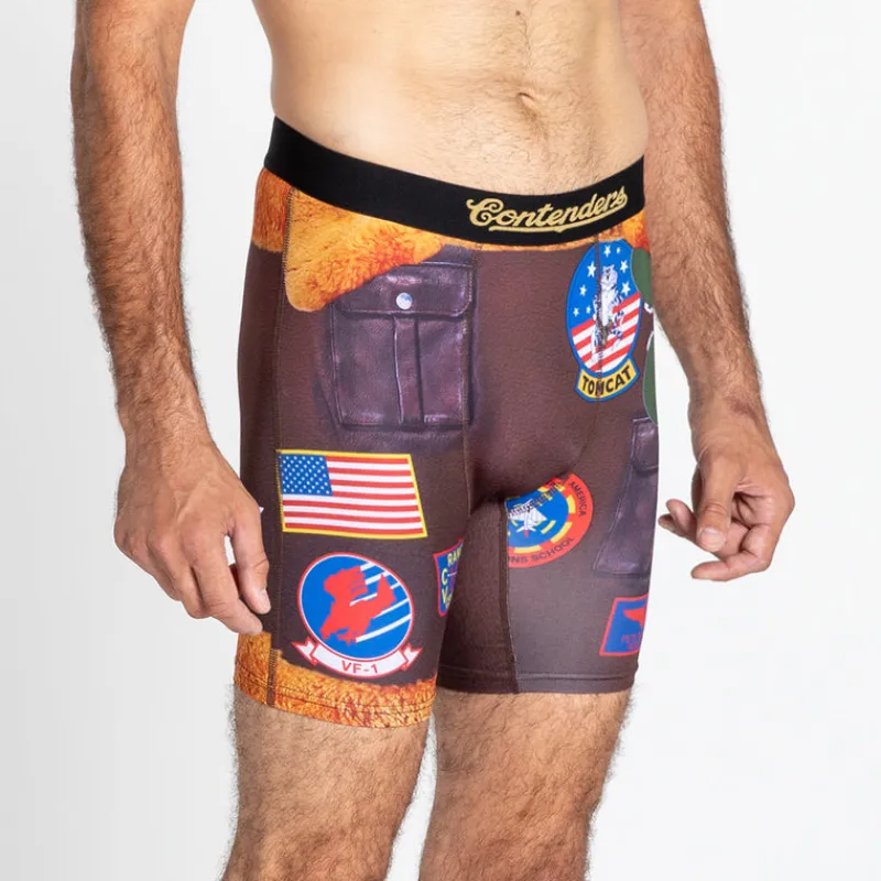 Pete ‘Maverick’ Mitchell is known for his ray bands and his Top Gun G-1 Navy flight leather jacket. Take someone’s breath away in our Top Gun Mitchell briefs. Every pair of Contenders boxer briefs features Contenders’ exclusive RIDE CONTROLTM – no ride-ups, total comfort, every time. Designed with care in California.