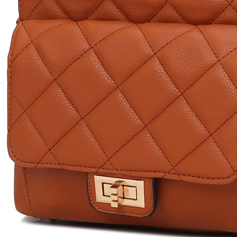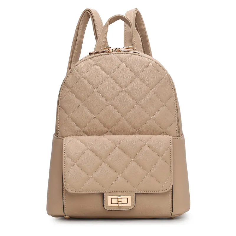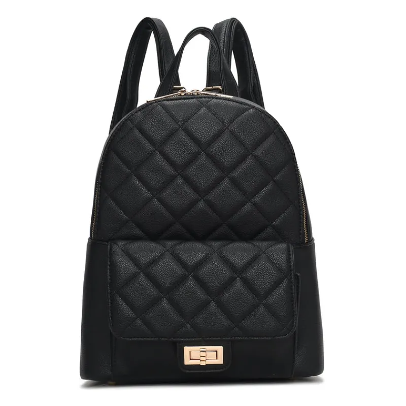– Exterior details: a front turn-lock closure pocket.