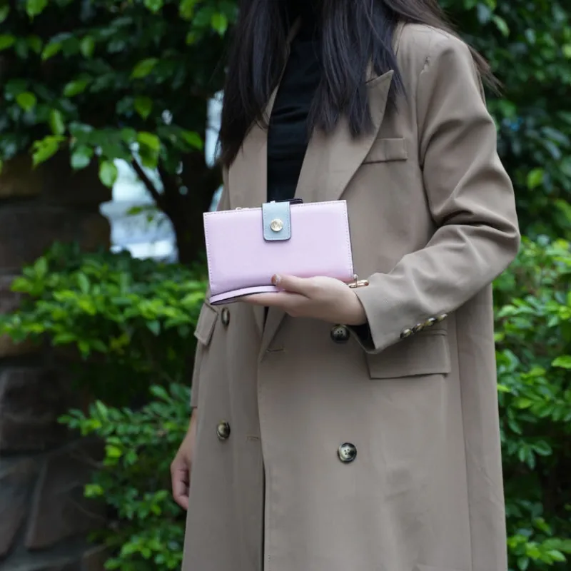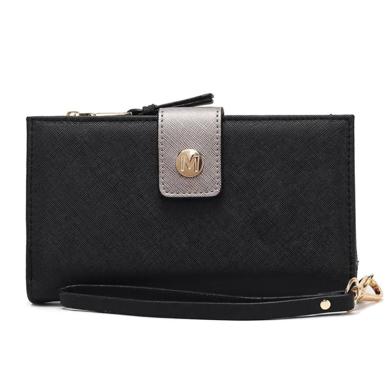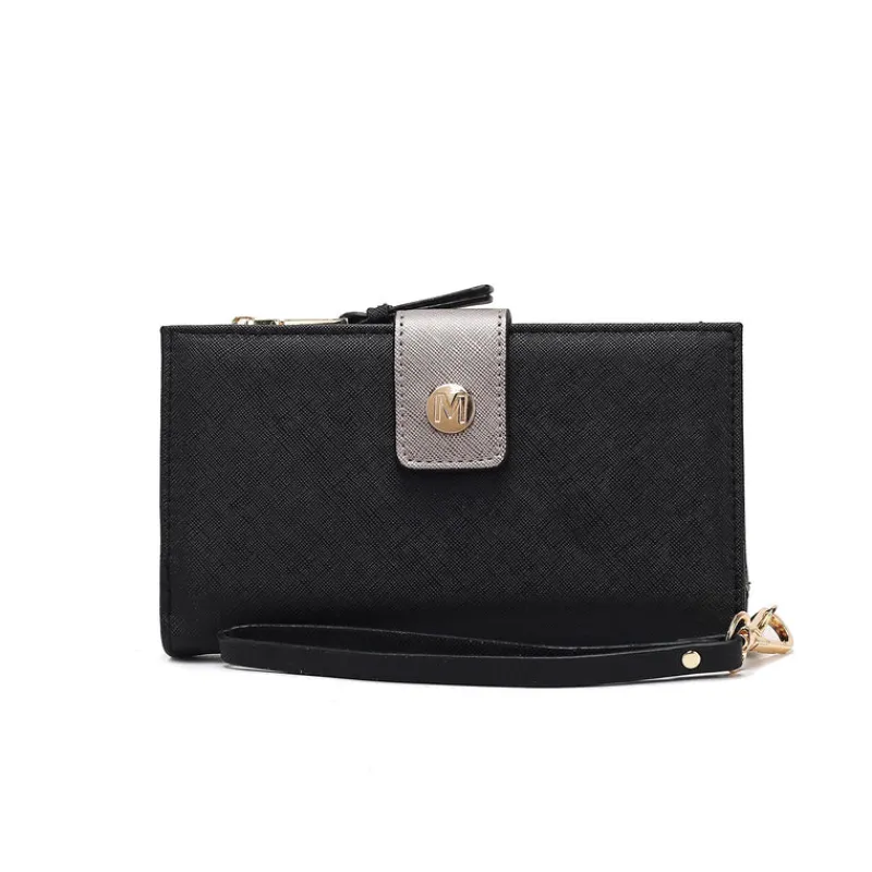 7.25” W x 4” H x 1” DWristlet handle – 6 “Interior details: features 6 card slots, 2 slit pockets, one bill co…